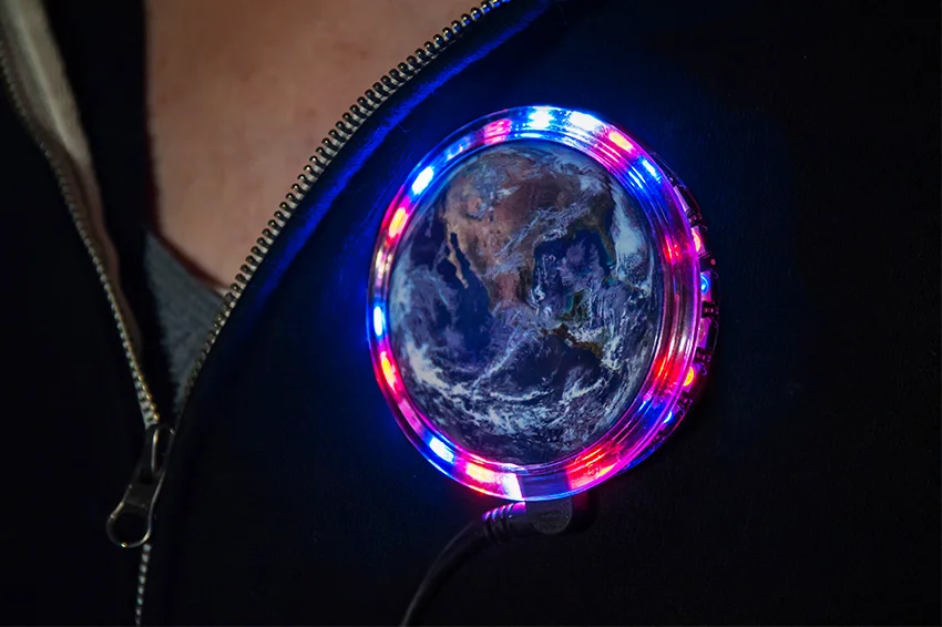 My latest tutorial for Adafruit is an International Space Station Notification Pin. Basically the pin is a ring of NeoPixels around an image of our planet Earth. Normally the pin shows a white comet-like streak of light orbiting Earth, but when the Space Station flies overhead, the LEDs will do a red, white and blue NASA light show. It’s an Internet of Things for space geeks project that I love, and it’s been five years in the making. The idea is actually based on a project that a friend and I created for a NASA Space Apps Challenge called the ISS Orbit Skirt. The prototype skirt has LEDs around the hemline that suggest the orbit of the station, and it received 3rd place in the challenge. I knew one day that microcontrollers would be able to connect with live data, yet be small enough for wearables. The Particle Photon was the handy microcontroller that made it a reality, but it took me some time to figure out how to get the code to work out, and also how to make the pin simple enough to be made without a 3D printer. I like projects that are accessible so anyone can make them.